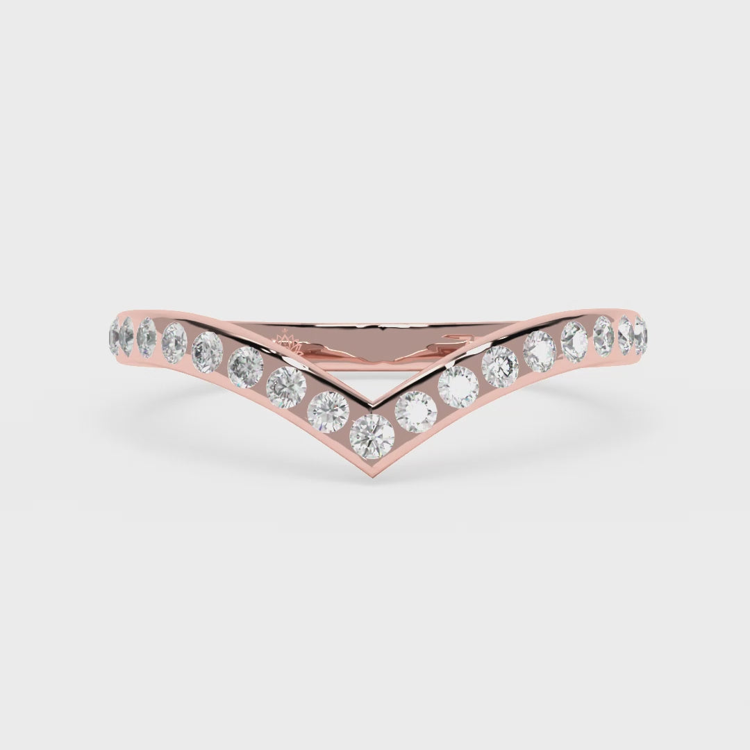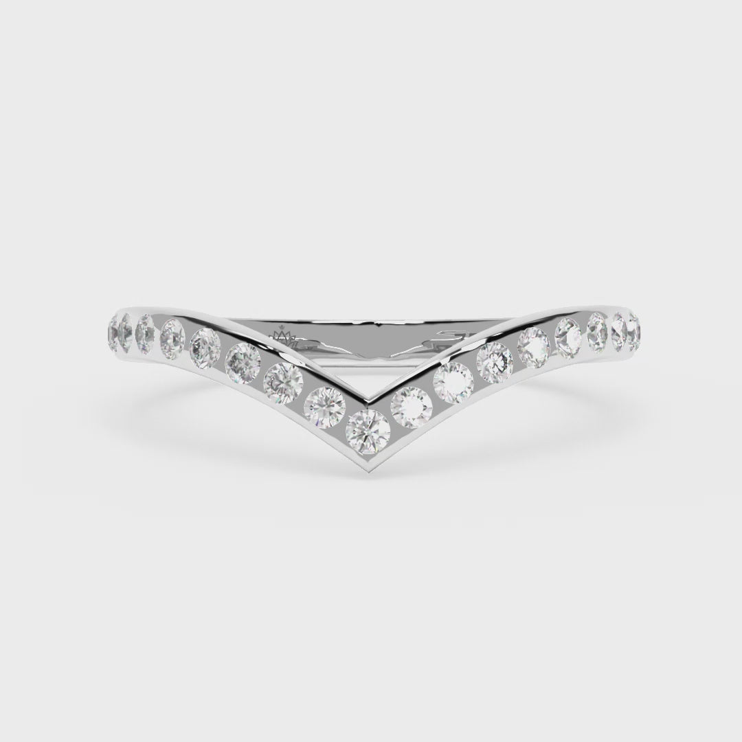 The Evangelia V Round Brilliant Cut Diamond Wedding Band features exquisitely cut round brilliant diamonds arranged in a distinctive V-shape formation, creating a wedding band of unparalleled sparkle and joyful symbolism. This sophisticated design combines the maximum brilliance of round brilliant cuts with the dynamic angular beauty of V-shape setting, embodying the "good news bearer" essence of Evangelia through extraordinary fire and celebratory radiance.